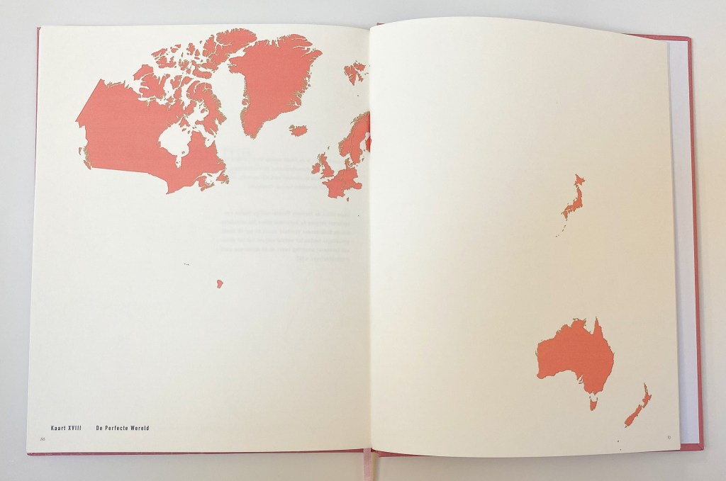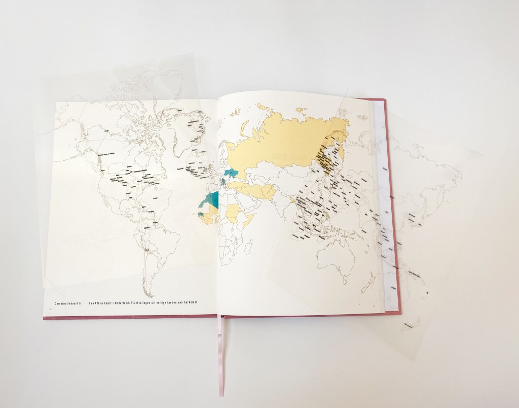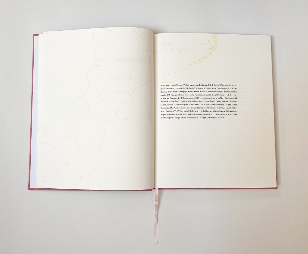 Onderzoek naar Mensen die Thuis Verlaten (‘Research on People leaving their Home’) This project displays the reasons for someone to leave their home country,.while showing the socio-economic differences within our world. The book consists of different world maps, and ends with a map of the ‘Perfect World’: a world that excludes all countries at war, with a bad economic status, with low life expectancy, that do not fulfil universal human rights, and more reasons that, according to ‘official statements’, make a country lack in quality of life.